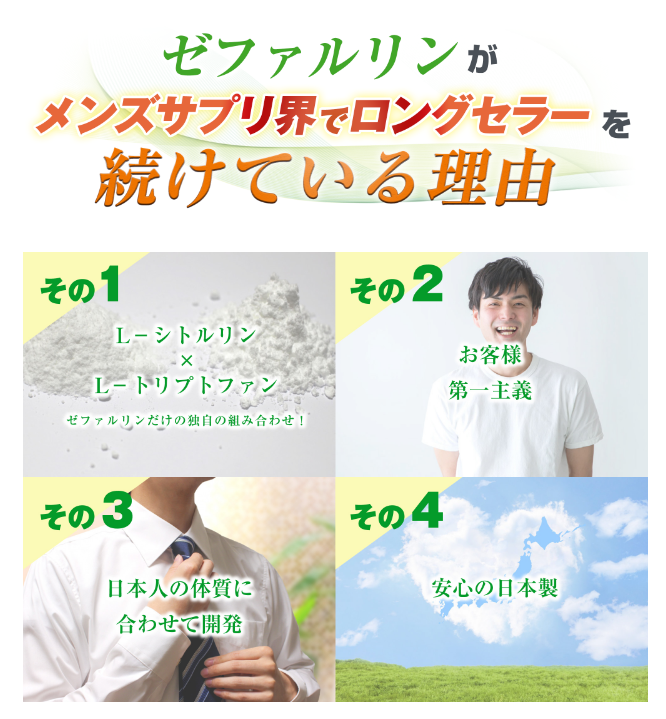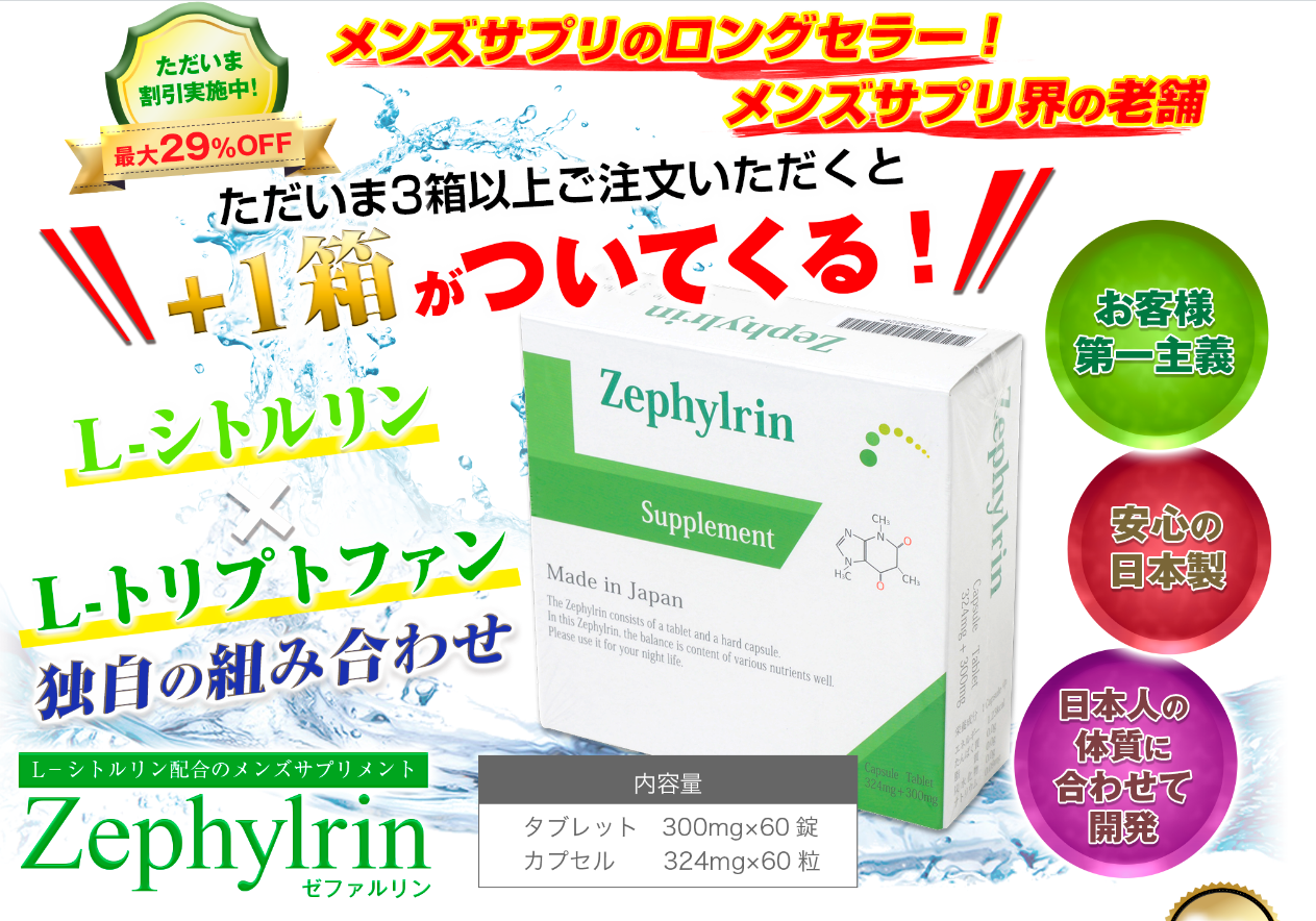 公式サイトはこちら ゼファルリンについてゼファルリンは貴方の「現役生活」を全力サポートする男性用サプリメントです。【おもは配合成分】・まむし末 ・すっぽん末 ・豚睾丸エキス末 ・有機マカ粉末 ・牡蠣エキス末 ・朝鮮人参末など 上記を含めて60以上の厳選された成分が含まれています。日本人男性の体質に合わて研究開発された日本人向けの日本製サプリメントです。商品名ゼファルリンカテゴリサプリメント