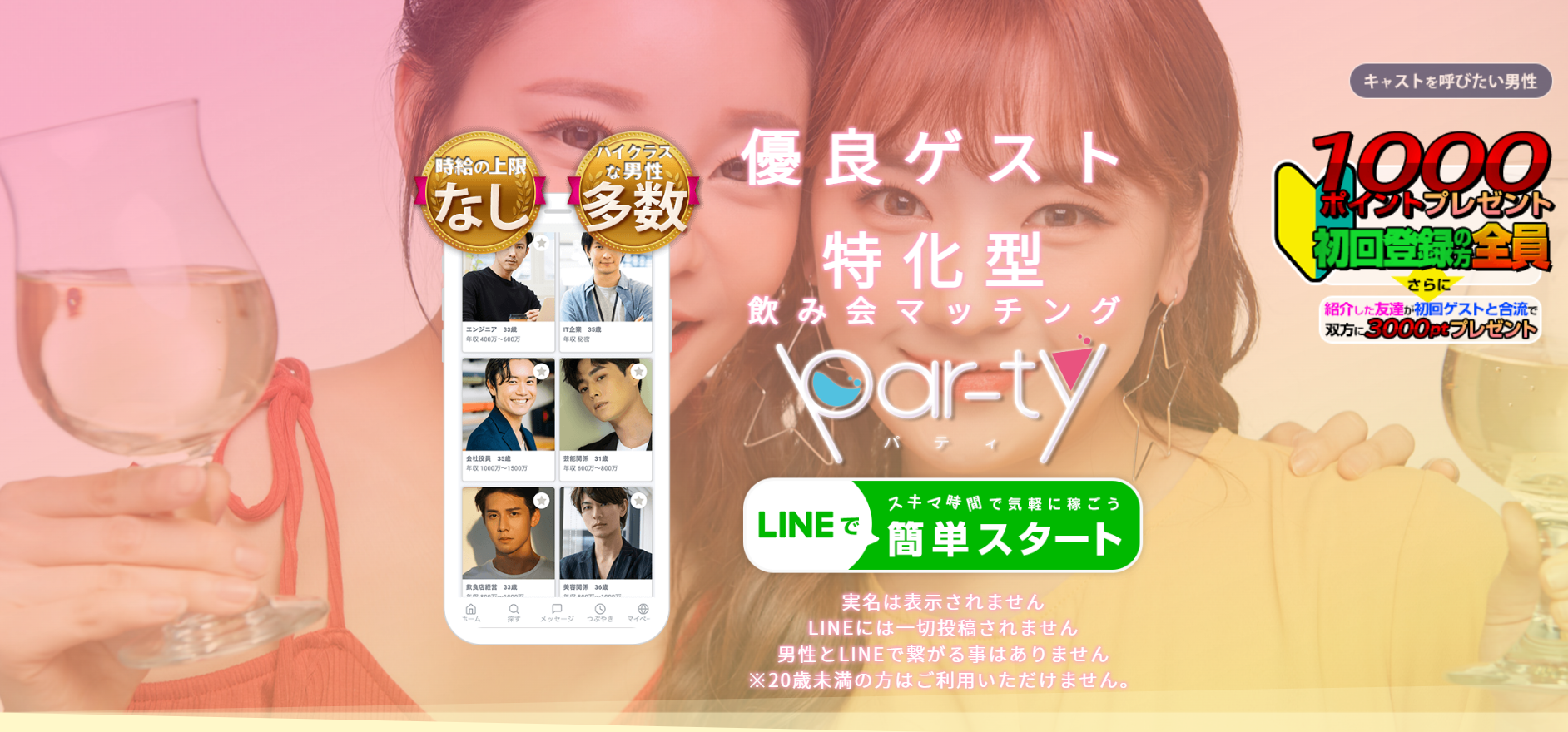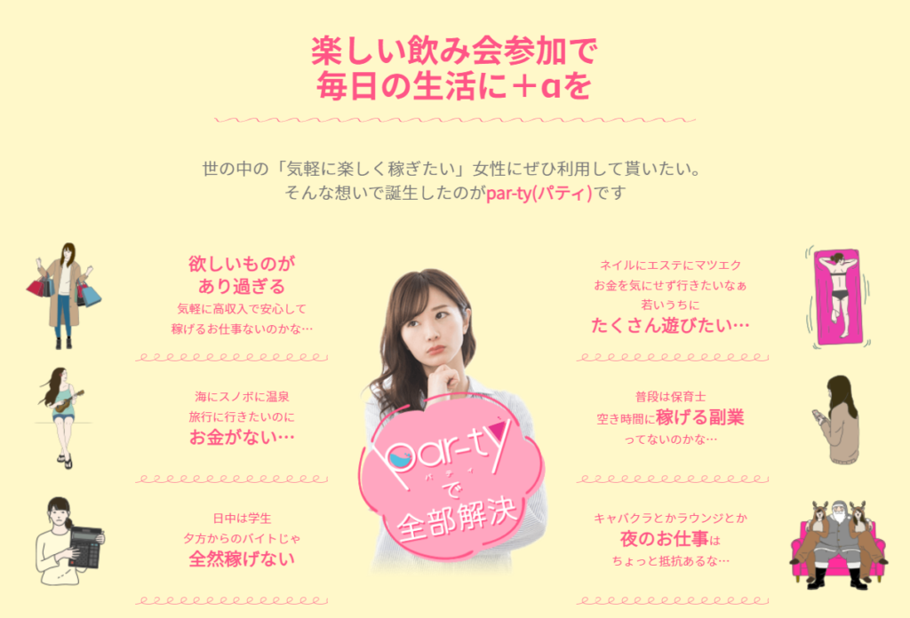 「par-ty」とは優良ゲスト特化型飲み会マッチングサービス。世の中の「気軽に楽しく稼ぎたい」女性にぜひ利用して貰いたいです。