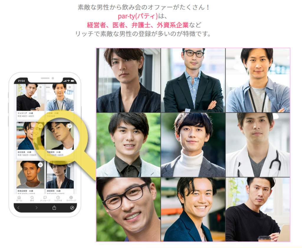 par-ty(パティ)は、経営者、医者、弁護士、外資系企業などリッチで素敵な男性の登録が多いのが特徴です。ハイスぺ男子と繋がりたい方におすすめです。