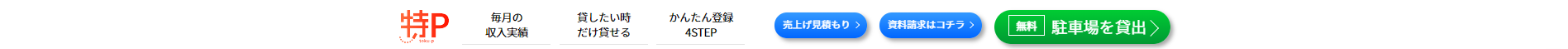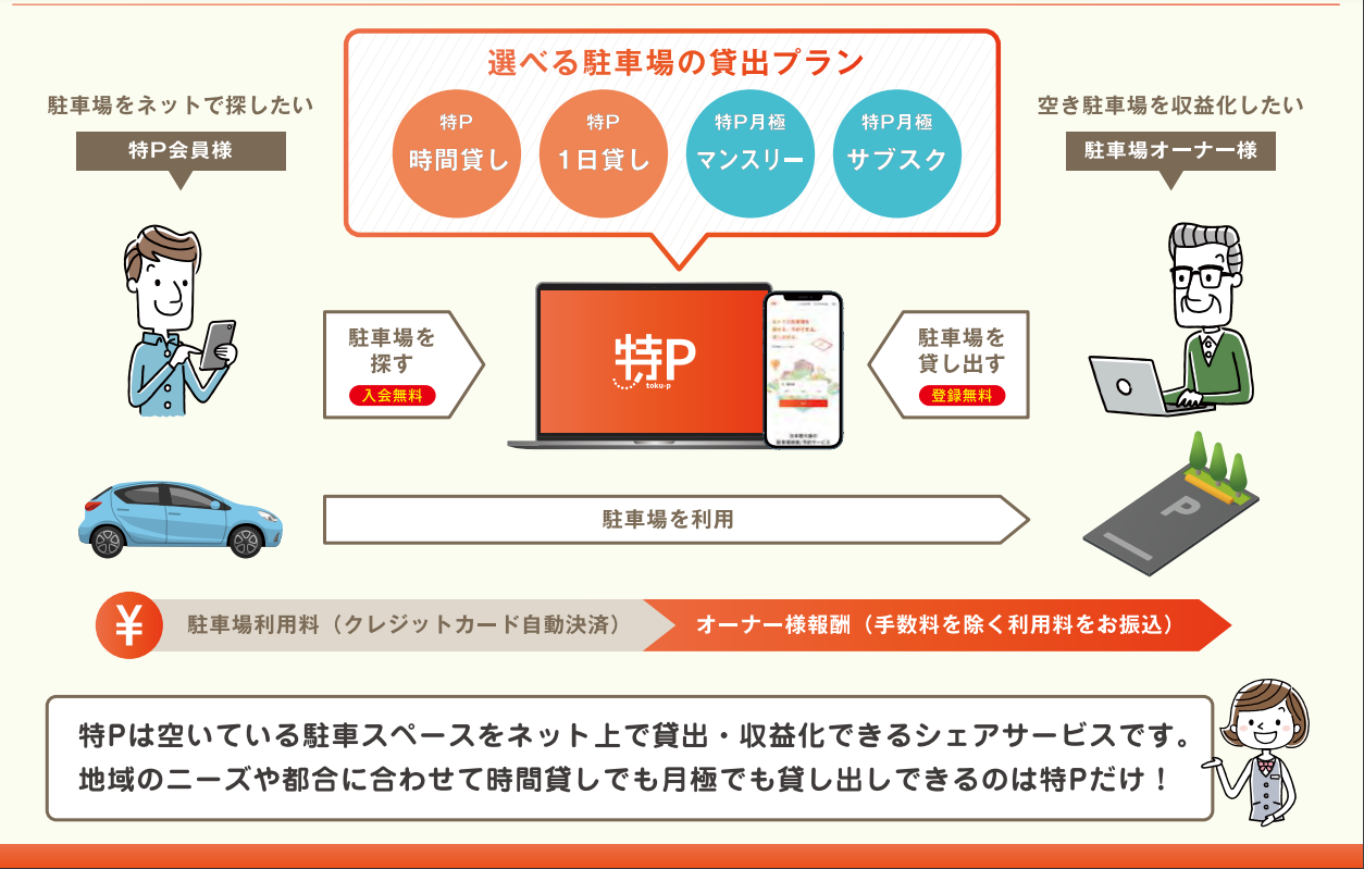 公式サイトはこちら 特Pについて「特P」は、いま月に100万人以上が利用している駐車場シェアサービスです。【特Pの特徴とメリット】・貸したい「駐車場」を「スマホ」から登録するだけ ・初期費用も月額費用も0円 ・設備不要で空きスペースを手を入れずにそのまま貸せます ・時間単位と月単位で、同時に柔軟に貸し出し可能 ・小スペースだけでもバイク専用として貸し出せる ・接客や面倒な作業は不要商品名特Pカテゴリ駐車場